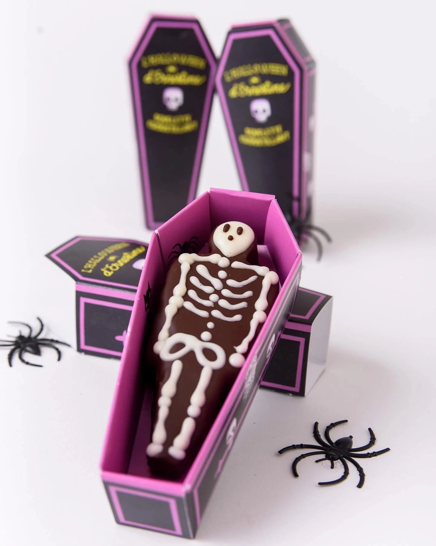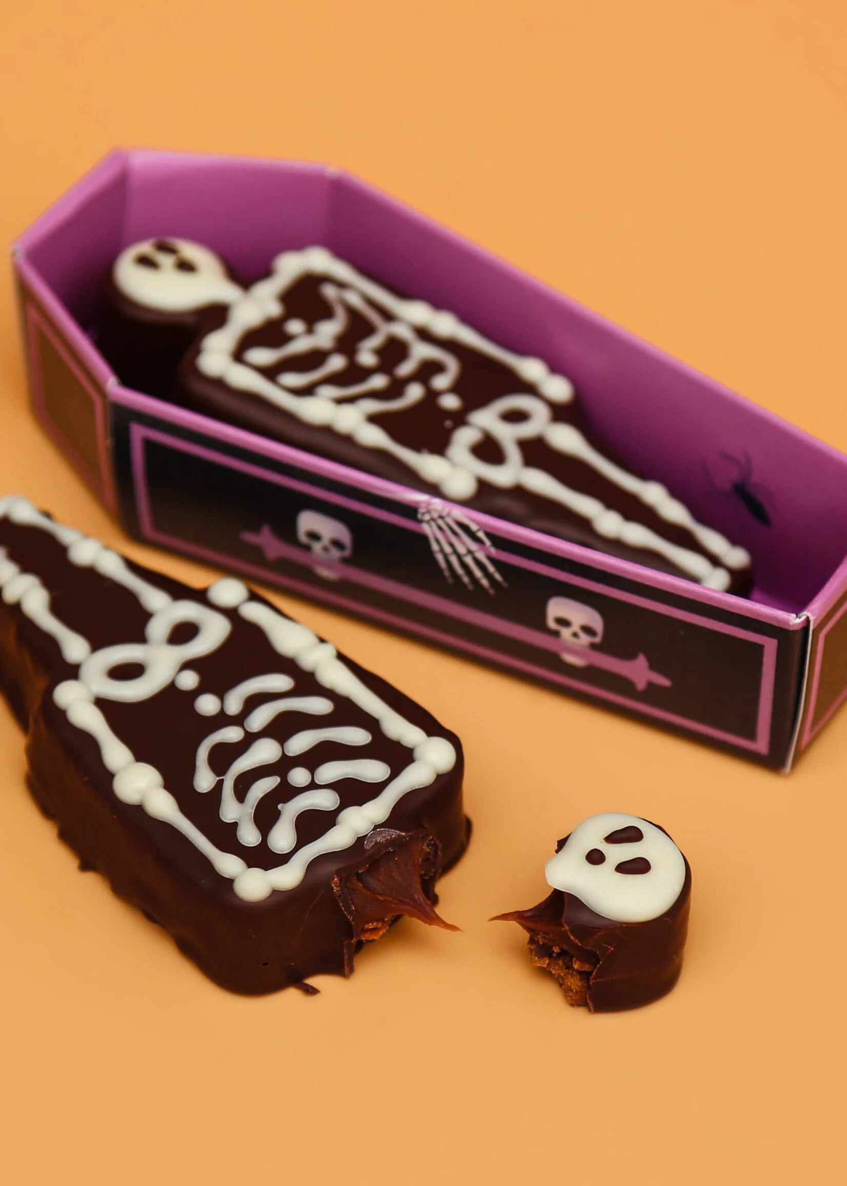 Il est de retour.. tout droit sorti d'outre-tombe, notre Squelette croustillant est garni de Praliné à la Noisette et de Caramel tendre, le tout enrobé de Chocolat noir et emballé dans un joli cercueil assorti.
