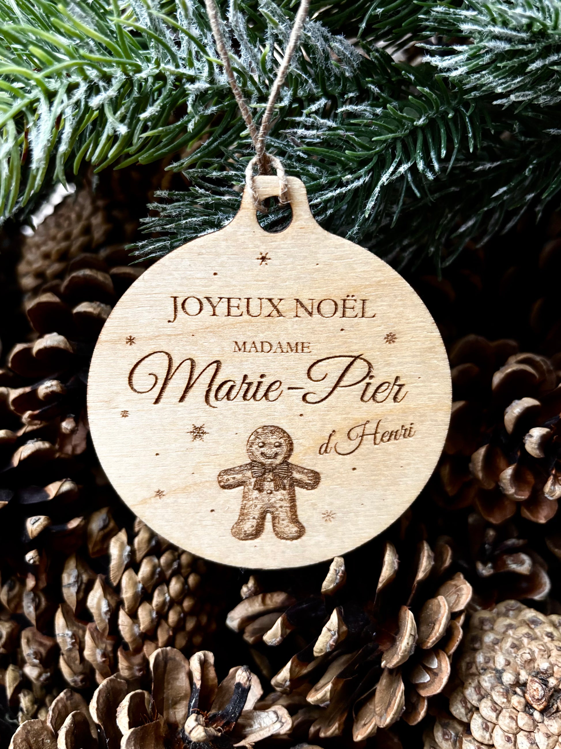 Ornement personnalisé avec le prénom de la personne et celui de l'enfant.
